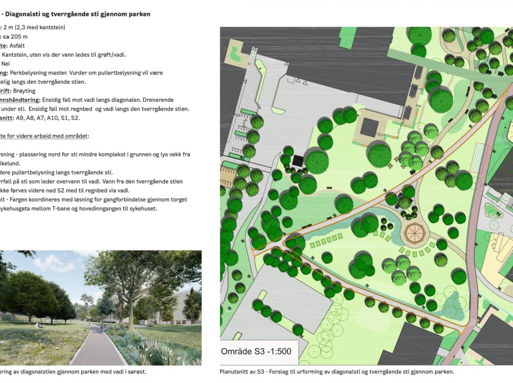 Master utomhusplan (MUP) beskriver både dagens situasjon og den planlagte utviklingen med nytt sykehjem, studentboliger, videregående skole og nytt torg med T‑banestasjon. Når flere bygg og virksomheter kommer til, øker kompleksiteten.